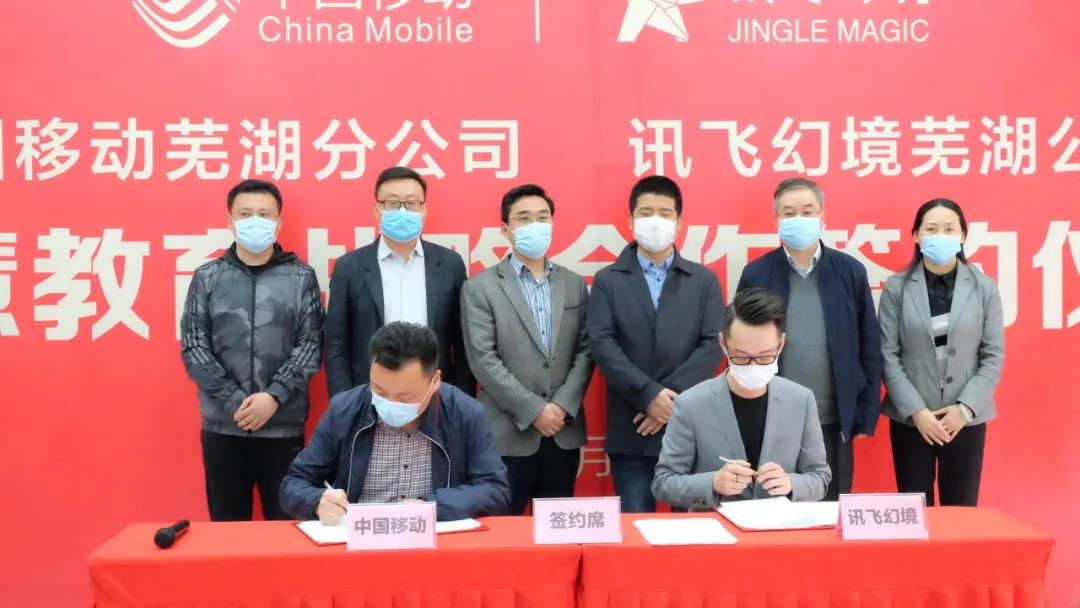 鏡湖區(qū)副區(qū)長(zhǎng)束曉偉及政府領(lǐng)導(dǎo)、相關(guān)單位負(fù)責(zé)人,訊飛幻境政企事業(yè)部執(zhí)行總裁李寧、中國(guó)移動(dòng)蕪湖分公司總經(jīng)理?xiàng)钫鸬瘸鱿⒁娮C簽約儀式,共同為雙方“智慧教育合作基地”揭牌。