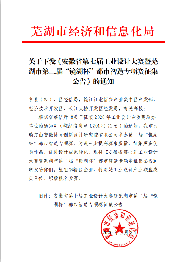 為進一步加快蕪湖市現(xiàn)代制造產業(yè)的升級轉型,加速工業(yè)設計與制造的融合,培養(yǎng)工業(yè)設計人才,決定舉辦安徽省第七屆工業(yè)設計大賽暨蕪湖市第二屆“鏡湖杯”都市智造專項賽。